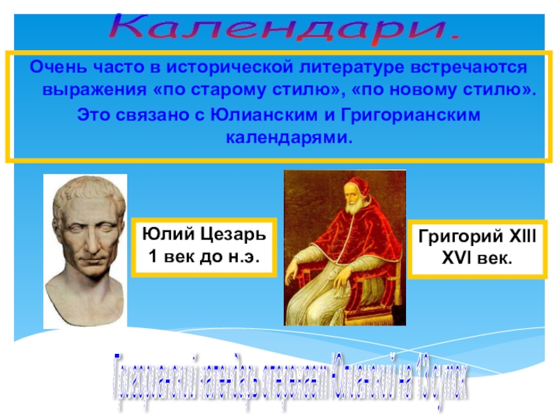 Календари. Очень часто в исторической литературе встречаются выражения «по старому стилю», «по новому стилю».Это связано с Юлианским