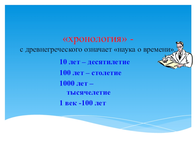 «хронология» - с древнегреческого означает «наука о времени».10 лет – десятилетие100 лет – столетие1000 лет –