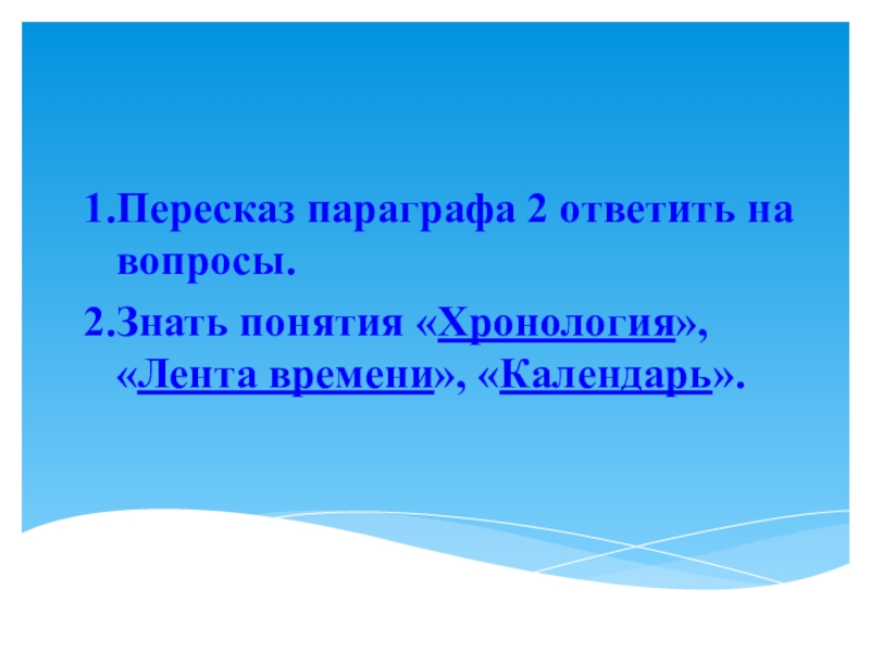 Домашнее задание1.Пересказ параграфа 2 ответить на вопросы.2.Знать понятия «Хронология», «Лента времени», «Календарь».