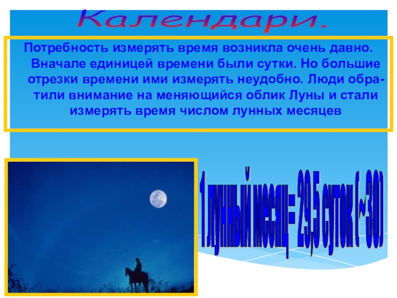 Календари. Потребность измерять время возникла очень давно. Вначале единицей времени были сутки. Но большие отрезки времени ими
