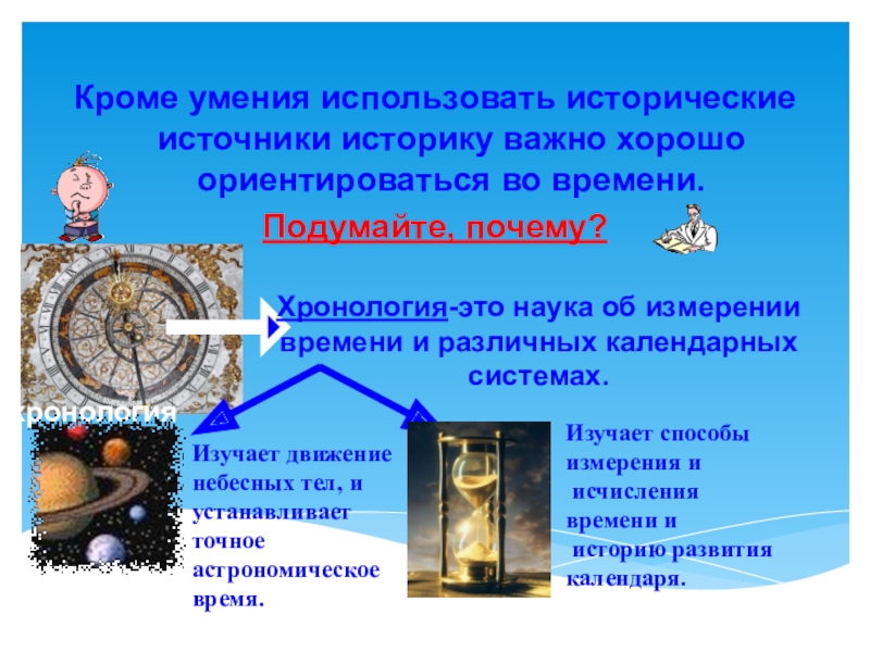 Хронология.Кроме умения использовать исторические источники историку важно хорошо ориентироваться во времени.Подумайте, почему?хронологияИзучает движениенебесных тел, иустанавливаетточноеастрономическоевремя.Изучает способыизмерения и