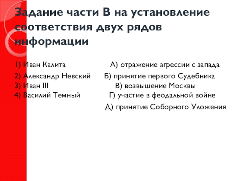 2) Александр Невский Б) принятие первого Судебника 3) Иван III В) возвышение Москвы 4) Василий Темный Г) участие в феодальной войне