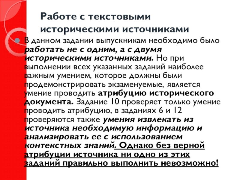 не с одним, а с двумя историческими источниками. Но при выполнении всех указанных заданий наиболее важным умением, которое должны были продемонстрировать экзаменуемые, является умение проводить атрибуцию исторического документа. Задание 10 проверяет только умение проводить атрибуцию, в заданиях 6 и 12 проверяются также умения извлекать из источника необходимую информацию и анализировать ее с использованием контекстных знаний. Однако без верной атрибуции источника ни одно из этих заданий правильно выполнить невозможно!