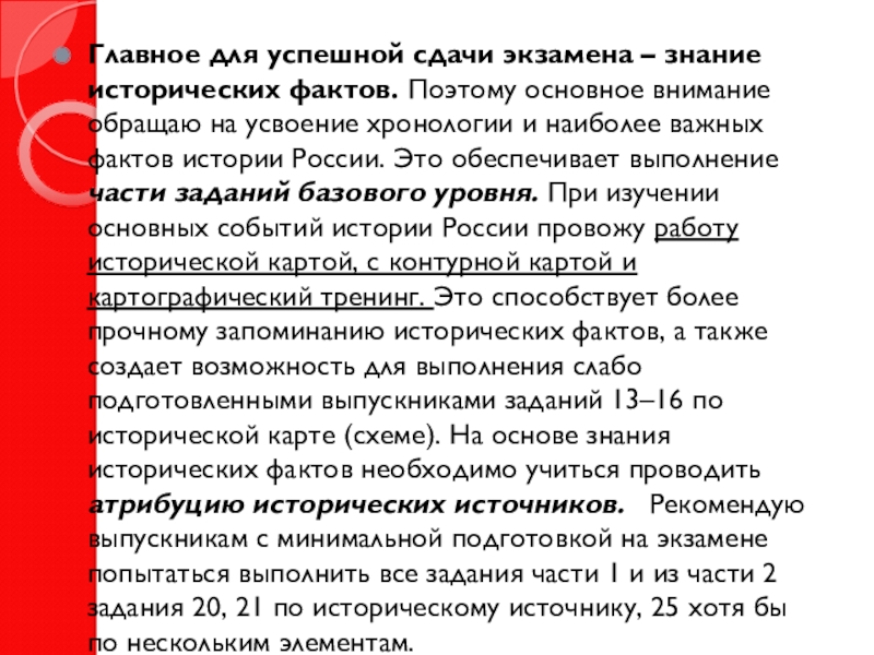 Слайд 16Главное для успешной сдачи экзамена – знание исторических фактов. Поэтому основное