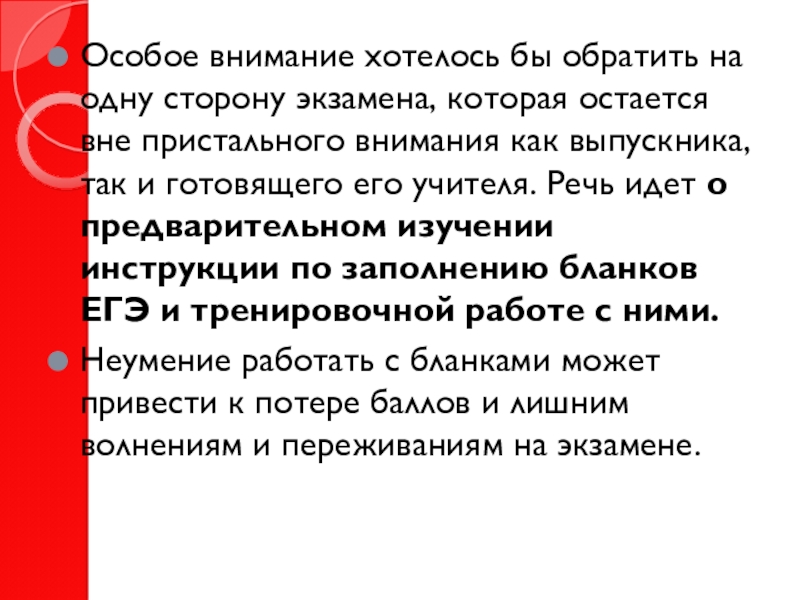 Слайд 24Особое внимание хотелось бы обратить на одну сторону экзамена, которая остается