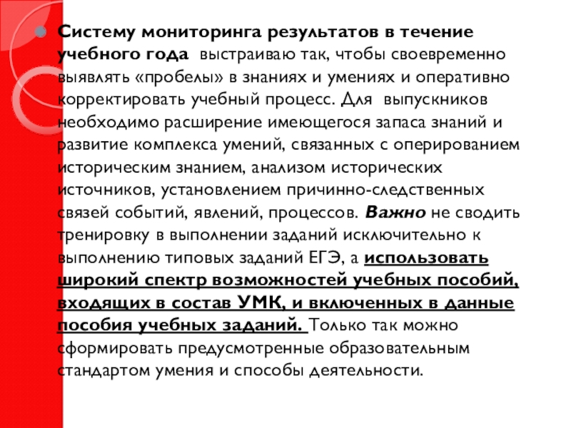 выявлять «пробелы» в знаниях и умениях и оперативно корректировать учебный процесс. Для выпускников необходимо расширение имеющегося запаса знаний и развитие комплекса умений, связанных с оперированием историческим знанием, анализом исторических источников, установлением причинно-следственных связей событий, явлений, процессов. Важно не сводить тренировку в выполнении заданий исключительно к выполнению типовых заданий ЕГЭ, а использовать широкий спектр возможностей учебных пособий, входящих в состав УМК, и включенных в данные пособия учебных заданий. Только так можно сформировать предусмотренные образовательным стандартом умения и способы деятельности.
