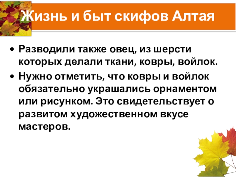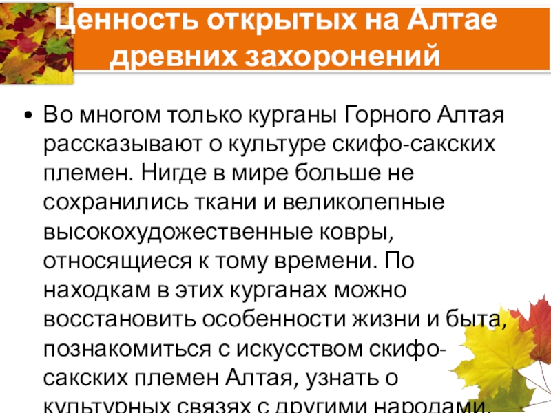 рассказывают о культуре скифо-сакских племен. Нигде в мире больше не сохранились ткани и великолепные высокохудожественные ковры, относящиеся к тому времени. По находкам в этих курганах можно восстановить особенности жизни и быта, познакомиться с искусством скифо-сакских племен Алтая, узнать о культурных связях с другими народами.