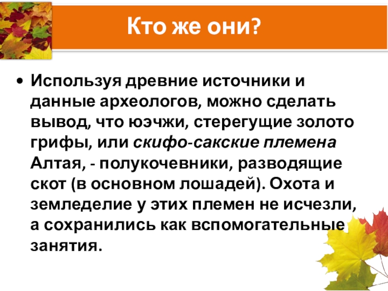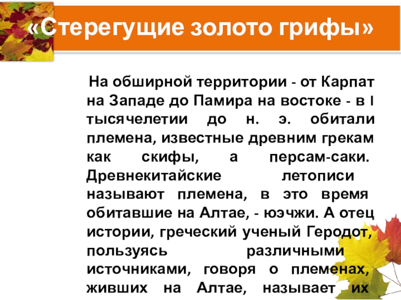 Западе до Памира на востоке - в I тысячелетии до н. э. обитали племена, известные древним грекам как скифы, а персам-саки. Древнекитайские летописи называют племена, в это время обитавшие на Алтае, - юэчжи. А отец истории, греческий ученый Геродот, пользуясь различными источниками, говоря о племенах, живших на Алтае, называет их "стерегущие золото грифы".