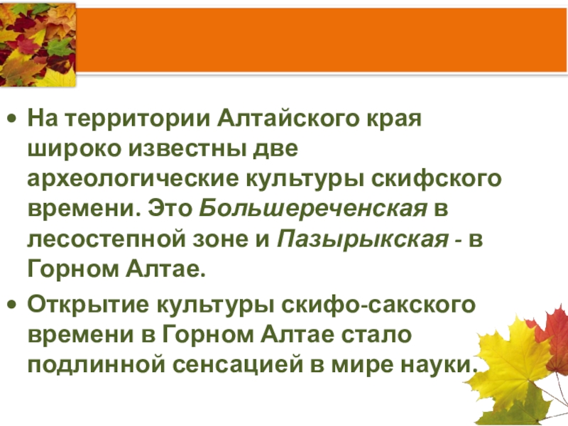 Слайд 4На территории Алтайского края широко известны две археологические культуры скифского времени.
