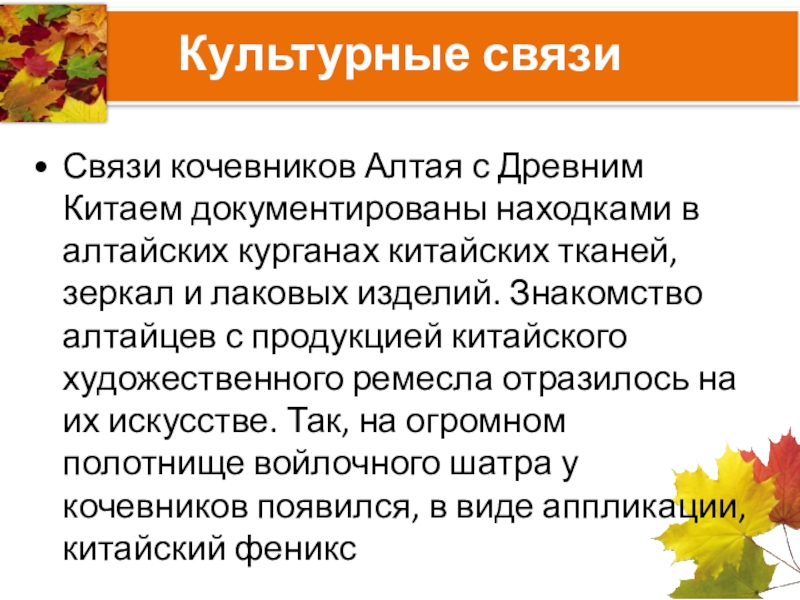 курганах китайских тканей, зеркал и лаковых изделий. Знакомство алтайцев с продукцией китайского художественного ремесла отразилось на их искусстве. Так, на огромном полотнище войлочного шатра у кочевников появился, в виде аппликации, китайский феникс