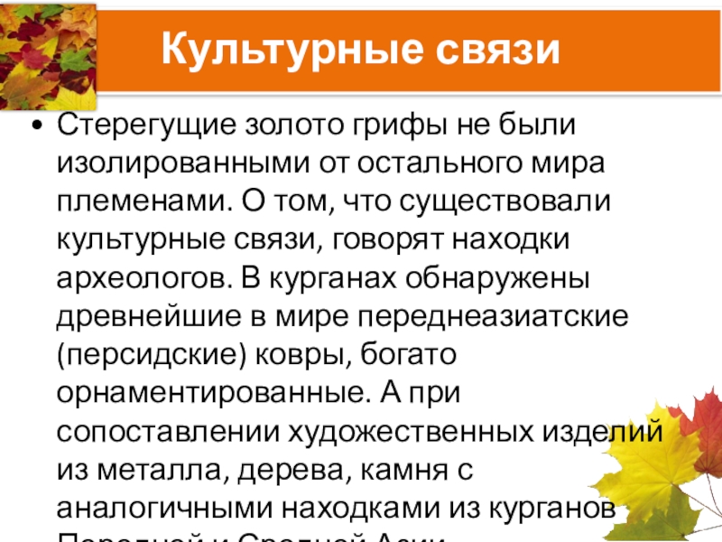 О том, что существовали культурные связи, говорят находки археологов. В курганах обнаружены древнейшие в мире переднеазиатские (персидские) ковры, богато орнаментированные. А при сопоставлении художественных изделий из металла, дерева, камня с аналогичными находками из курганов Передней и Средней Азии