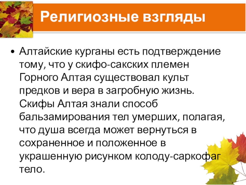 Алтая существовал культ предков и вера в загробную жизнь. Скифы Алтая знали способ бальзамирования тел умерших, полагая, что душа всегда может вернуться в сохраненное и положенное в украшенную рисунком колоду-саркофаг тело.