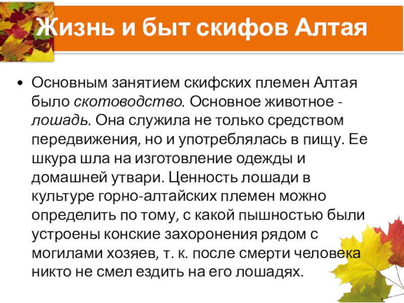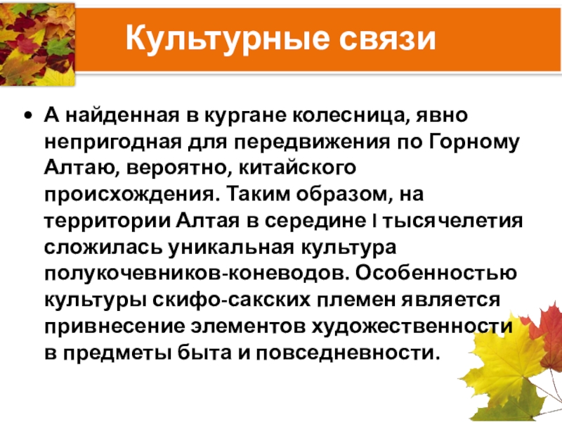 Горному Алтаю, вероятно, китайского происхождения. Таким образом, на территории Алтая в середине I тысячелетия сложилась уникальная культура полукочевников-коневодов. Особенностью культуры скифо-сакских племен является привнесение элементов художественности в предметы быта и повседневности.