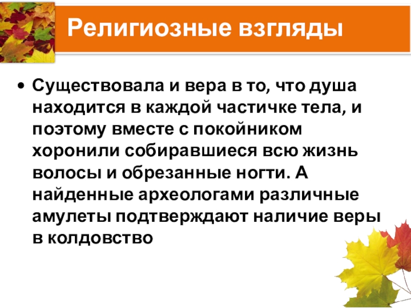 частичке тела, и поэтому вместе с покойником хоронили собиравшиеся всю жизнь волосы и обрезанные ногти. А найденные археологами различные амулеты подтверждают наличие веры в колдовство