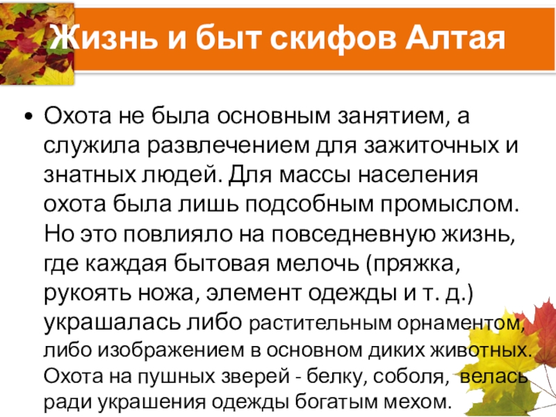 развлечением для зажиточных и знатных людей. Для массы населения охота была лишь подсобным промыслом. Но это повлияло на повседневную жизнь, где каждая бытовая мелочь (пряжка, рукоять ножа, элемент одежды и т. д.) украшалась либо растительным орнаментом, либо изображением в основном диких животных. Охота на пушных зверей - белку, соболя, велась ради украшения одежды богатым мехом.