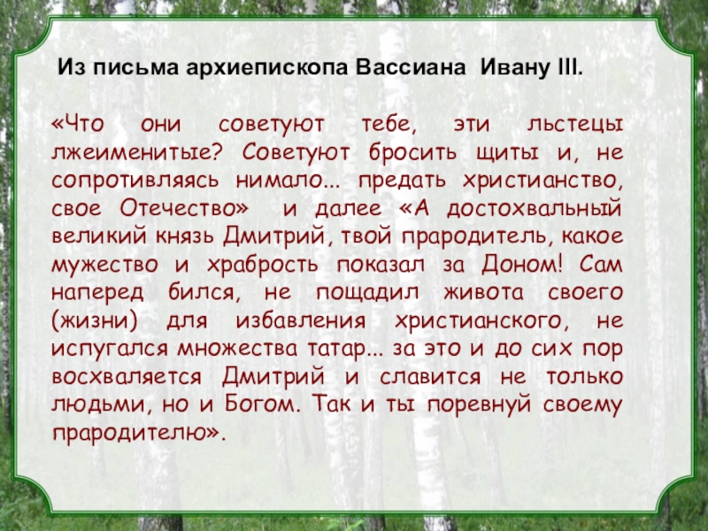 Слайд 12 Из письма архиепископа Вассиана Ивану III.