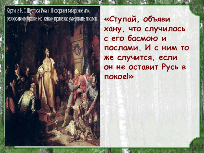 Слайд 10«Ступай, объяви хану, что случилось с его басмою и послами. И