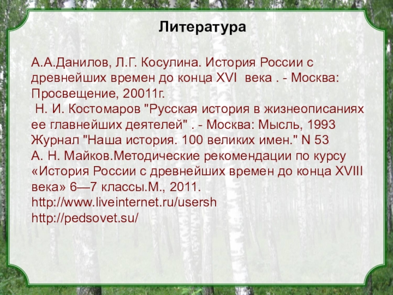 А. Н. Майков.Методические рекомендации по курсу «История России с древнейших времен до конца XVIII века» 6—7 классы.М., 2011.