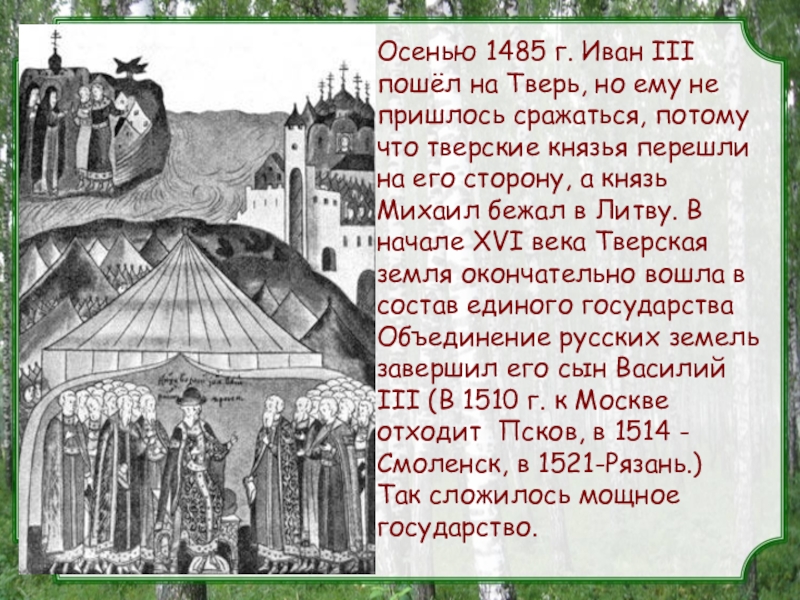 пришлось сражаться, потому что тверские князья перешли на его сторону, а князь Михаил бежал в Литву. В начале XVI века Тверская земля окончательно вошла в состав единого государства Объединение русских земель завершил его сын Василий III (В 1510 г. к Москве отходит Псков, в 1514 - Смоленск, в 1521-Рязань.)