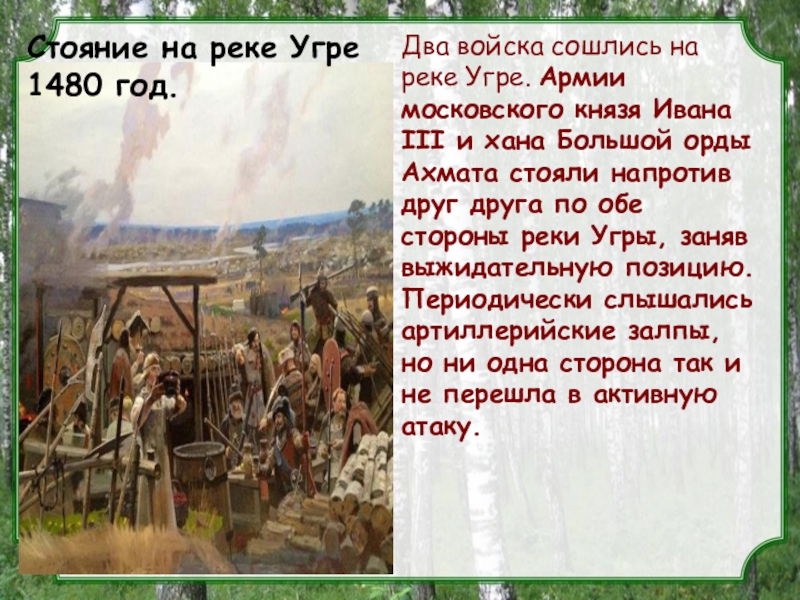 и хана Большой орды Ахмата стояли напротив друг друга по обе стороны реки Угры, заняв выжидательную позицию. Периодически слышались артиллерийские залпы, но ни одна сторона так и не перешла в активную атаку.
