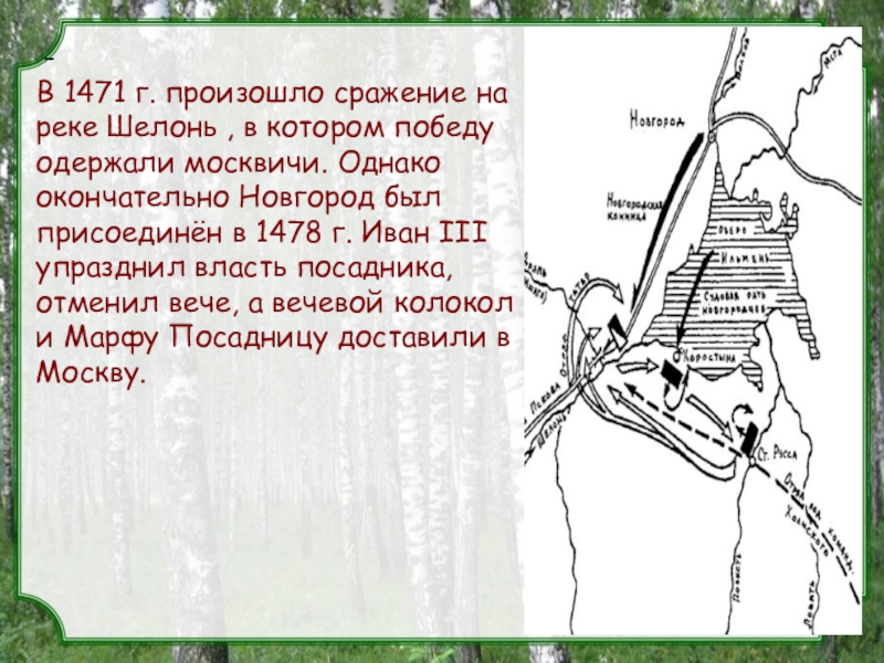 победу одержали москвичи. Однако окончательно Новгород был присоединён в 1478 г. Иван III упразднил власть посадника, отменил вече, а вечевой колокол и Марфу Посадницу доставили в Москву.
