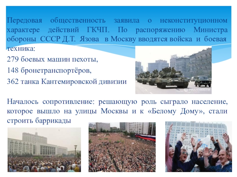 Слайд 114Передовая общественность заявила о неконституционном характере действий ГКЧП. По распоряжению Министра