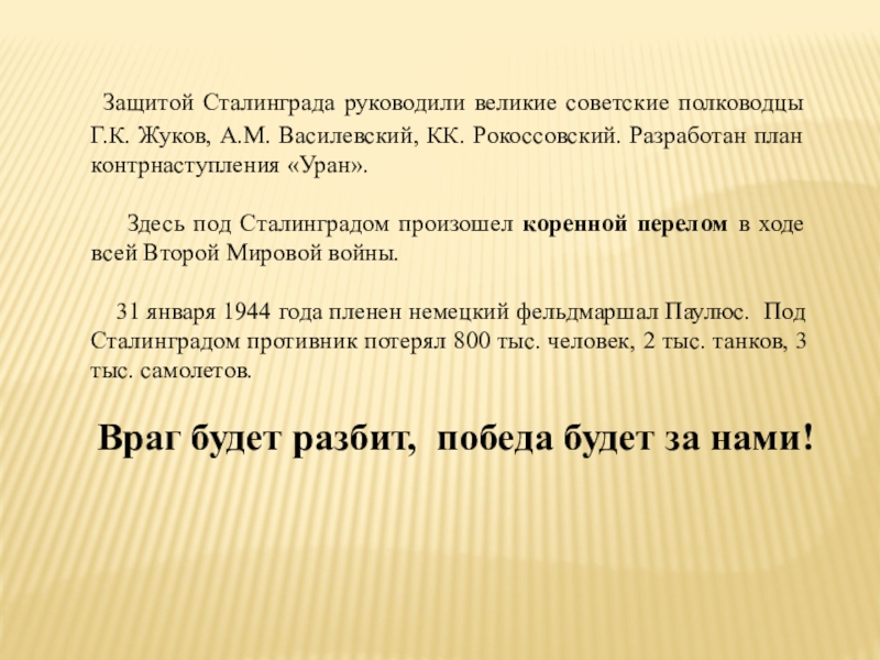 Защитой Сталинграда руководили великие советские полководцы Г.К. Жуков, А.М. Василевский, КК. Рокоссовский. Разработан план контрнаступления «Уран».