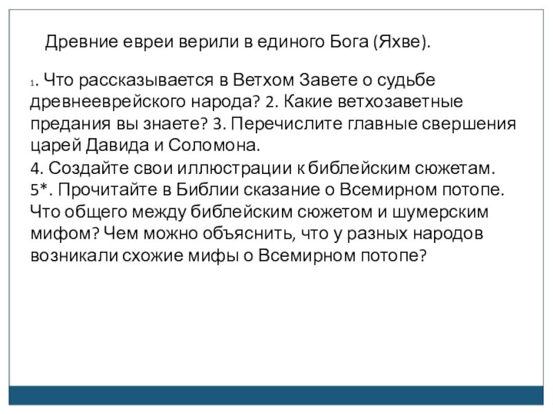 Завете о судьбе древнееврейского народа? 2. Какие ветхозаветные предания вы знаете? 3. Перечислите главные свершения царей Давида и Соломона.
