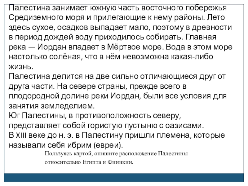 нему районы. Лето здесь сухое, осадков выпадает мало, поэтому в древности в период дождей воду приходилось собирать. Главная река — Иордан впадает в Мёртвое море. Вода в этом море настолько солёная, что в нём невозможна какая-либо жизнь.