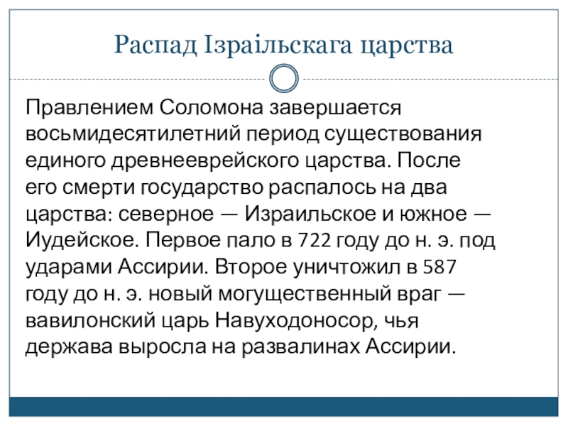 После его смерти государство распалось на два царства: северное — Израильское и южное — Иудейское. Первое пало в 722 году до н. э. под ударами Ассирии. Второе уничтожил в 587 году до н. э. новый могущественный враг — вавилонский царь Навуходоносор, чья держава выросла на развалинах Ассирии.
