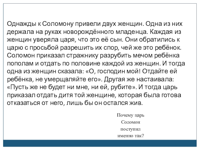 Слайд 10Однажды к Соломону привели двух женщин. Одна из них держала на