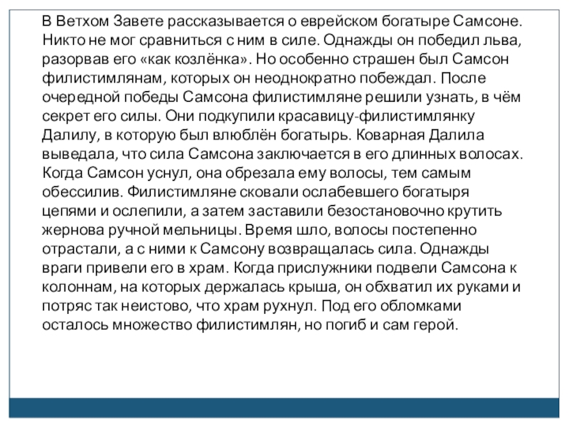 Слайд 6В Ветхом Завете рассказывается о еврейском богатыре Самсоне. Никто не мог
