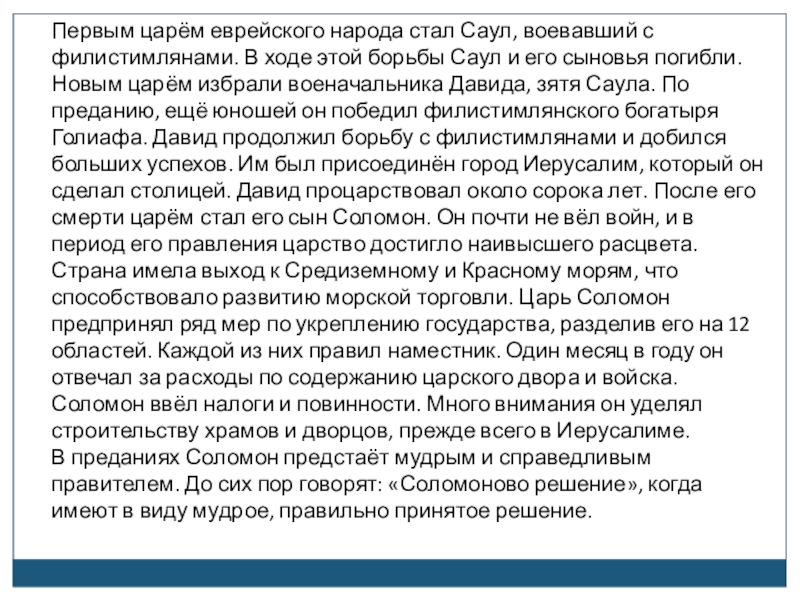 Слайд 8Первым царём еврейского народа стал Саул, воевавший с филистимлянами. В ходе