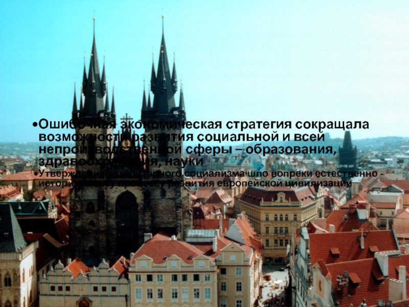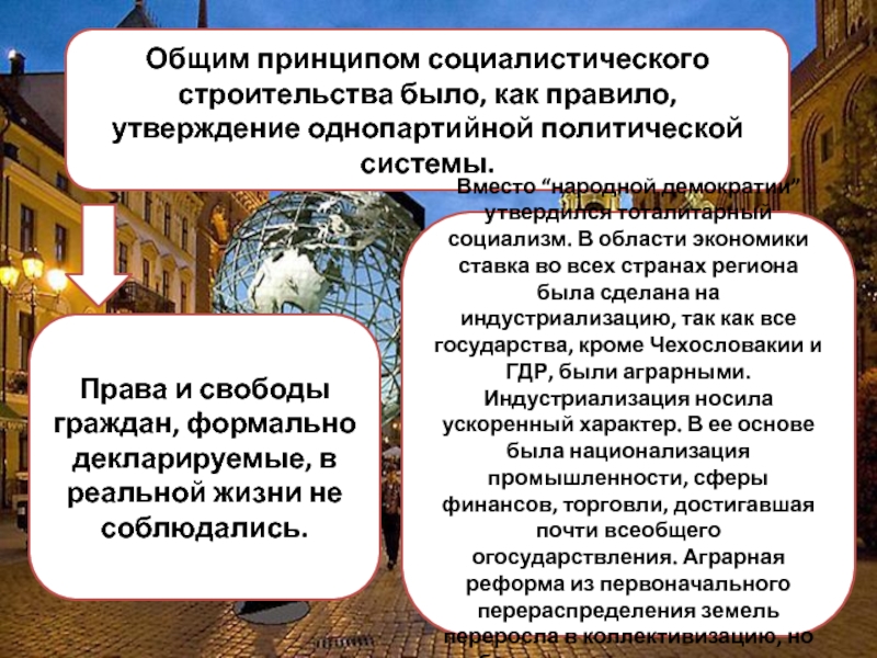 Вместо “народной демократии” утвердился тоталитарный социализм. В области экономики ставка во всех странах региона была сделана на индустриализацию, так как все государства, кроме Чехословакии и ГДР, были аграрными. Индустриализация носила ускоренный характер. В ее основе была национализация промышленности, сферы финансов, торговли, достигавшая почти всеобщего огосударствления. Аграрная реформа из первоначального перераспределения земель переросла в коллективизацию, но без национализации земли.