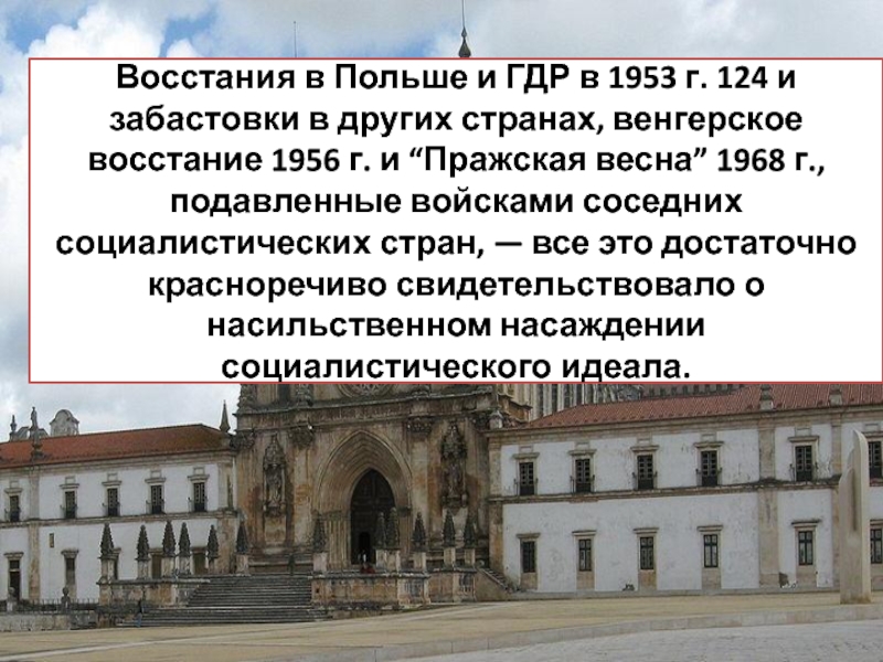 Завершив процесс утверждения единовластия, который был назван тогда периодом “народно-демократических революций”, коммунистические партии этих стран про- возгласили начало строительства социализма.