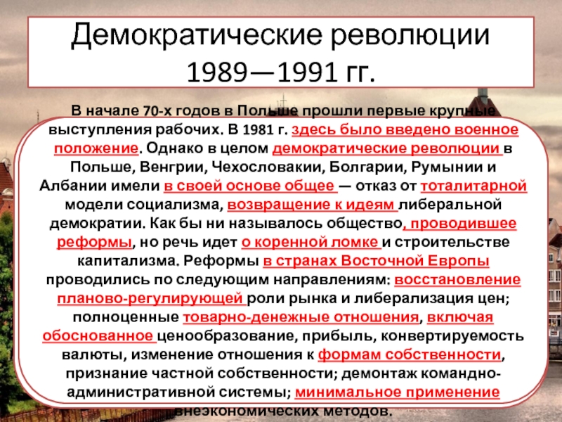 В начале 70-х годов в Польше прошли первые крупные выступления рабочих. В 1981 г. здесь было введено военное положение. Однако в целом демократические революции в Польше, Венгрии, Чехословакии, Болгарии, Румынии и Албании имели в своей основе общее — отказ от тоталитарной модели социализма, возвращение к идеям либеральной демократии. Как бы ни называлось общество, проводившее реформы, но речь идет о коренной ломке и строительстве капитализма. Реформы в странах Восточной Европы проводились по следующим направлениям: восстановление планово-регулирующей роли рынка и либерализация цен; полноценные товарно-денежные отношения, включая обоснованное ценообразование, прибыль, конвертируемость валюты, изменение отношения к формам собственности, признание частной собственности; демонтаж командно- административной системы; минимальное применение внеэкономических методов.