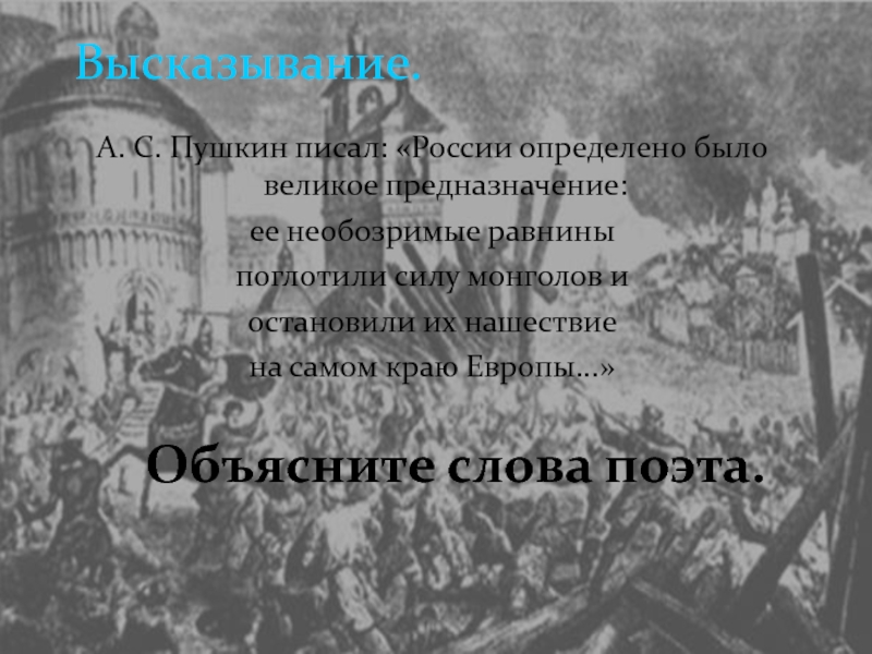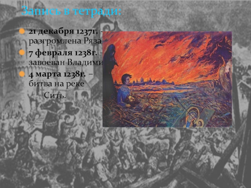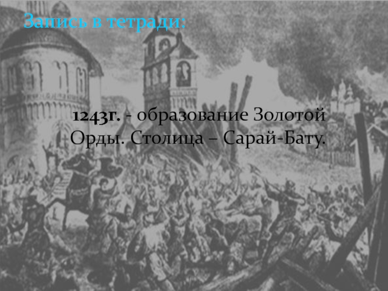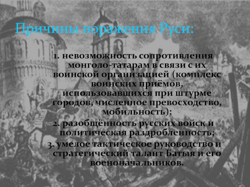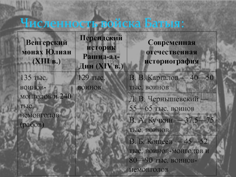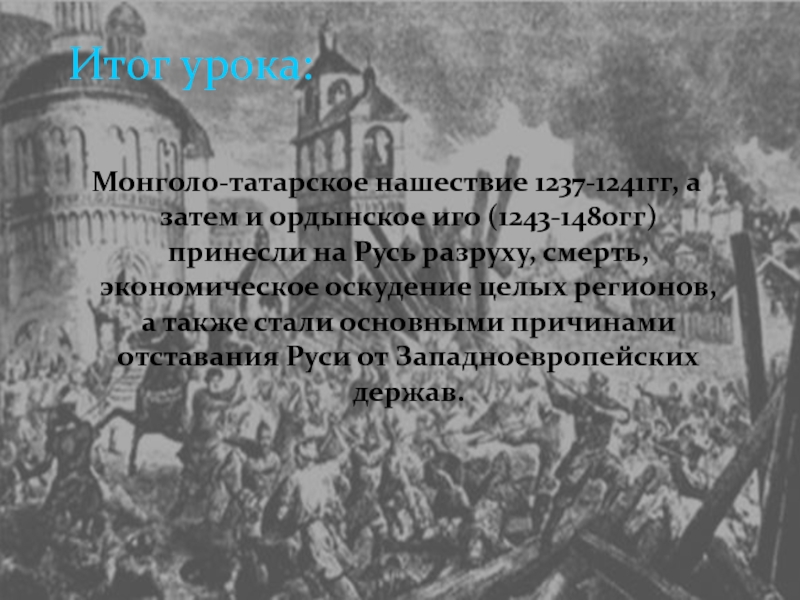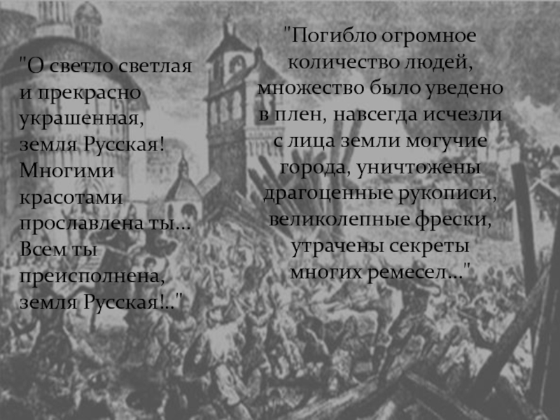 "Погибло огромное количество людей, множество было уведено в плен, навсегда исчезли с лица земли могучие города, уничтожены драгоценные рукописи, великолепные фрески, утрачены секреты многих ремесел..."