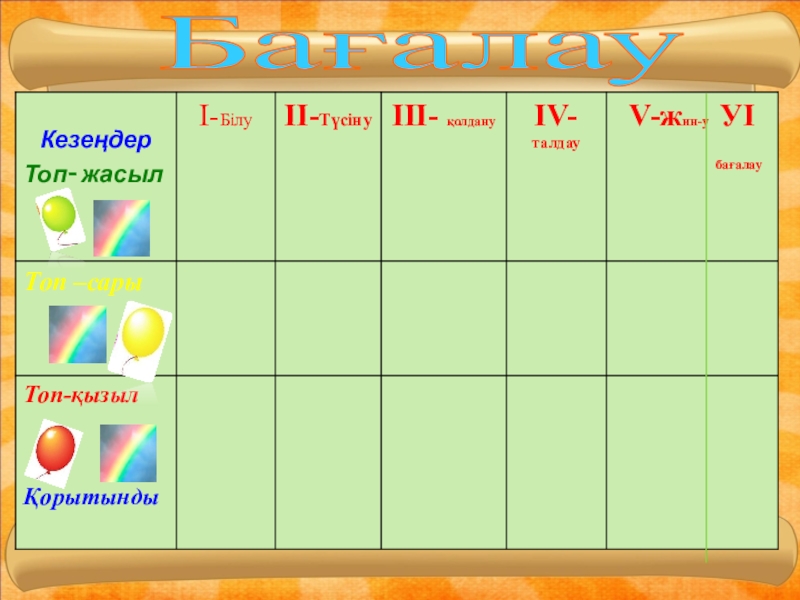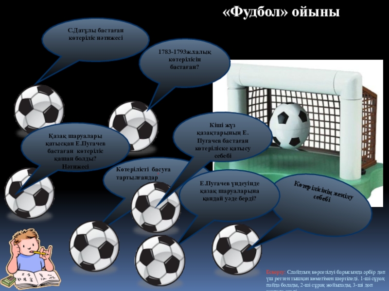 Ескерту: Слайдтың көрсетілуі барысында әрбір доп үш реттен тышқан көмегімен шертіледі. 1-ші сұрақ пайда болады, 2-ші сұрақ жойылады, 3-ші доп қақпаға енеді.