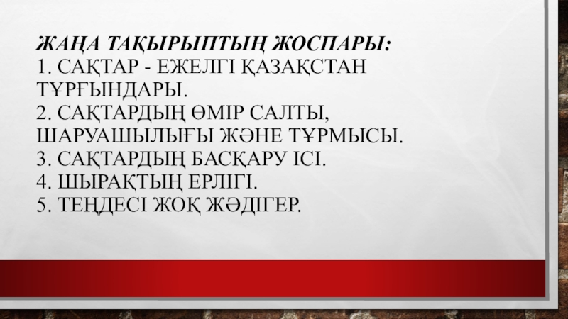 Слайд 3Жаңа тақырыптың жоспары: 1. Сақтар - ежелгі Қазақстан тұрғындары. 2. Сақтардың өмір салты,шаруашылығы