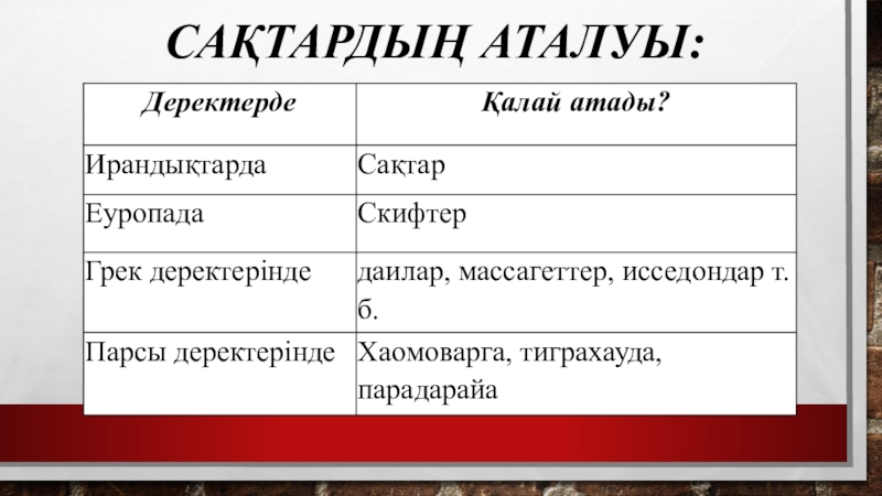 Презентация, доклад тақырыбы: Сақтар; 5 сынып; Қазақстан тарихынан