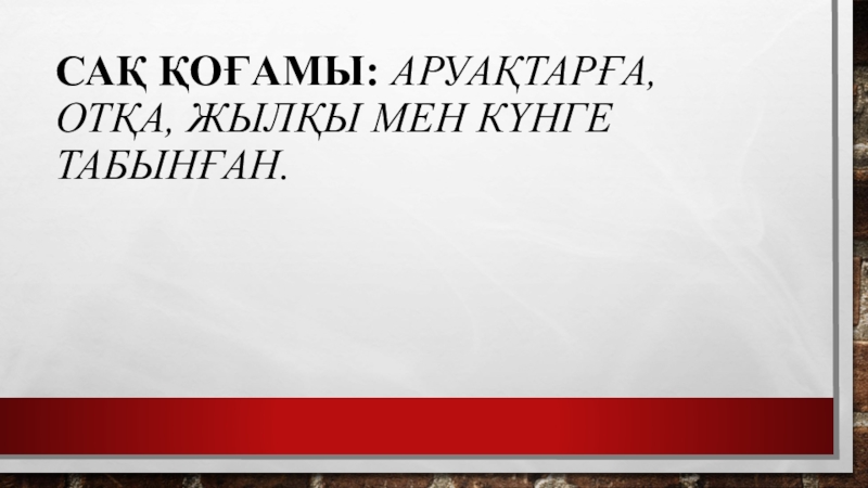 Слайд 11Сақ қоғамы: аруақтарға, отқа, жылқы мен күнге табынған.