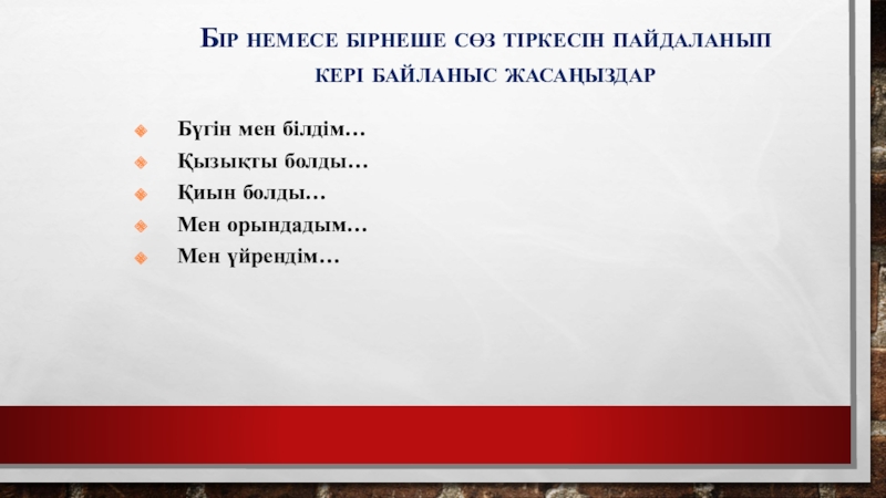 Бүгін мен білдім…Қызықты болды…Қиын болды…Мен орындадым…Мен үйрендім… Бір немесе бірнеше сөз тіркесін пайдаланып кері байланыс жасаңыздар