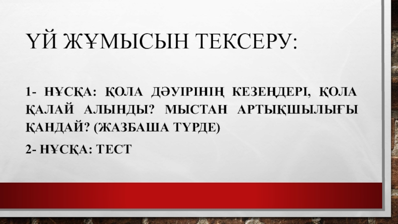 Үй жұмысын тексеру:1- нұсқа: Қола дәуірінің кезеңдері, қола қалай алынды? Мыстан артықшылығы қандай? (жазбаша түрде)2- нұсқа: тест