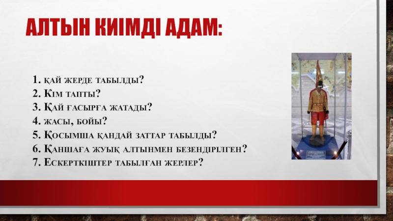 Алтын киімді адам:  1. қай жерде табылды?2. Кім тапты?3. Қай ғасырға жатады?4. жасы, бойы?5. Қосымша қандай