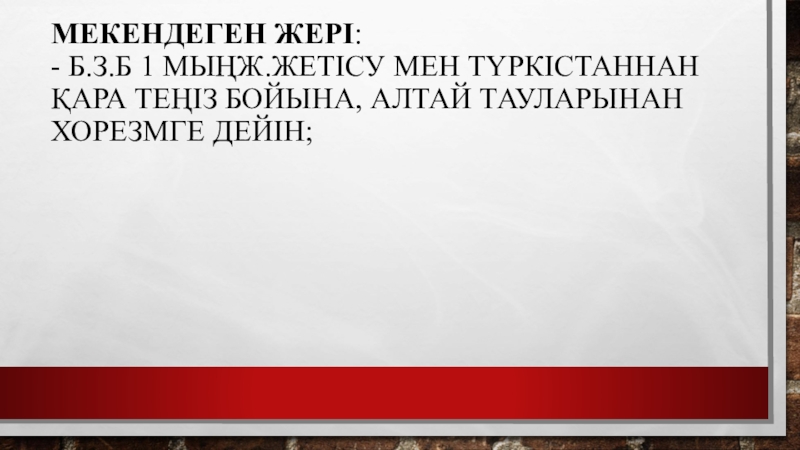 Слайд 5Мекендеген жері: - б.з.б 1 мыңж.Жетісу мен Түркістаннан Қара теңіз бойына,