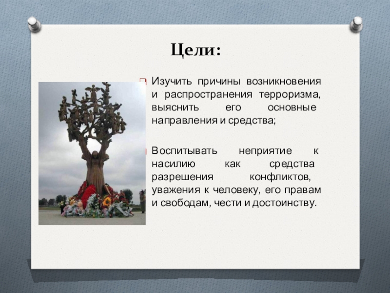 Цели: Изучить причины возникновения и распространения терроризма, выяснить его основные направления и средства;Воспитывать неприятие к насилию