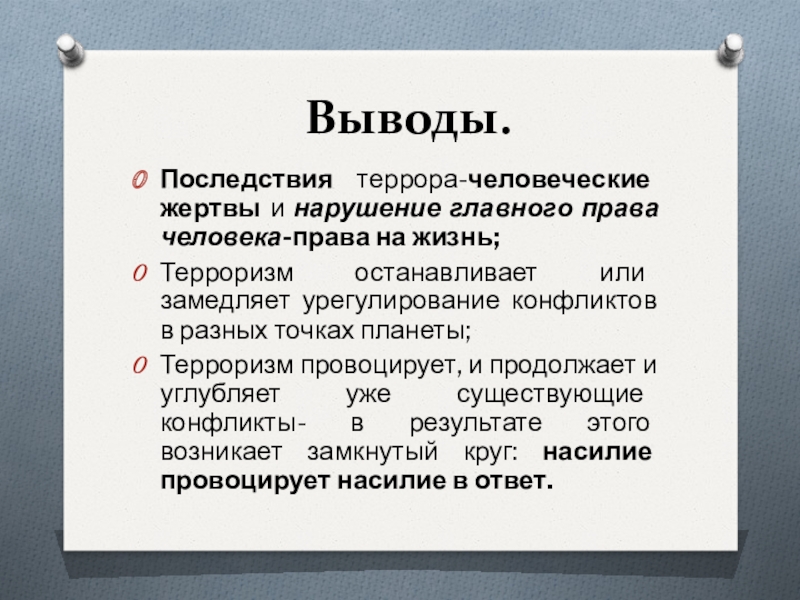 Выводы.Последствия террора-человеческие жертвы и нарушение главного права человека-права на жизнь;Терроризм останавливает или замедляет урегулирование конфликтов в разных