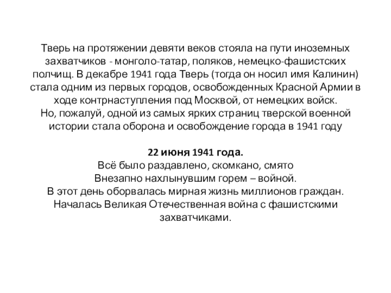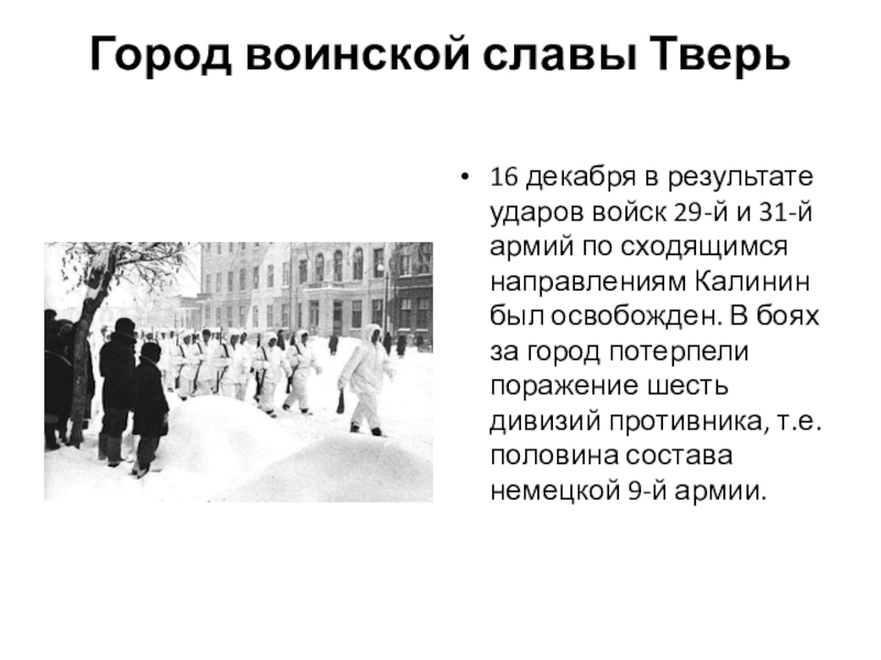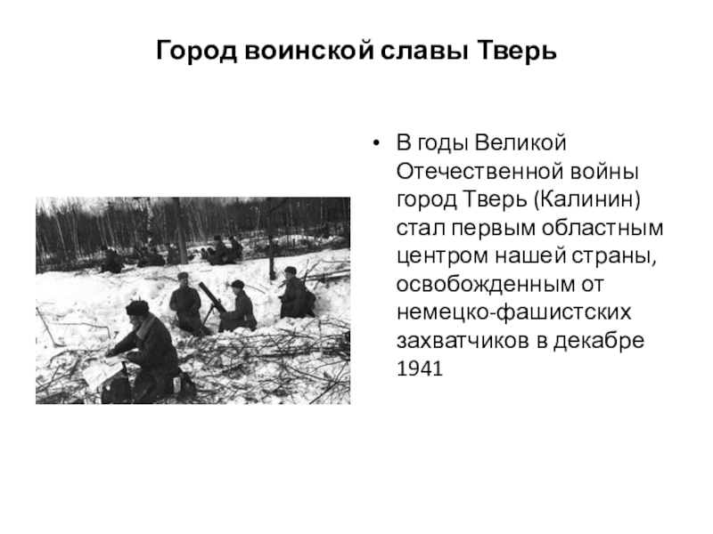 монголо-татар, поляков, немецко-фашистских полчищ. В декабре 1941 года Тверь (тогда он носил имя Калинин) стала одним из первых городов, освобожденных Красной Армии в ходе контрнаступления под Москвой, от немецких войск.