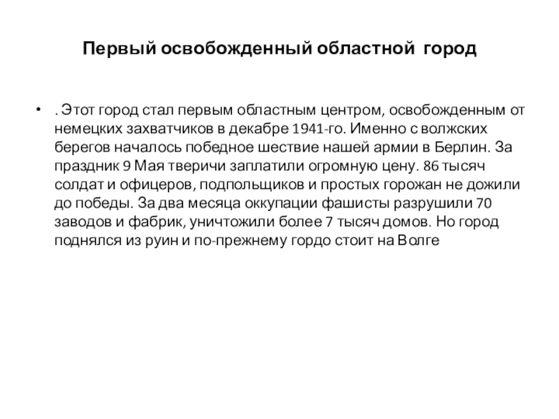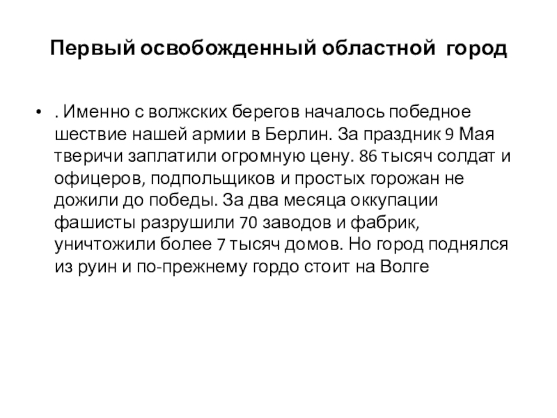 нашей армии в Берлин. За праздник 9 Мая тверичи заплатили огромную цену. 86 тысяч солдат и офицеров, подпольщиков и простых горожан не дожили до победы. За два месяца оккупации фашисты разрушили 70 заводов и фабрик, уничтожили более 7 тысяч домов. Но город поднялся из руин и по-прежнему гордо стоит на Волге