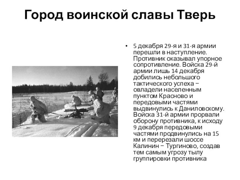 наступление. Противник оказывал упорное сопротивление. Войска 29-й армии лишь 14 декабря добились небольшого тактического успеха − овладели населенным пунктом Красново и передовыми частями выдвинулись к Даниловскому. Войска 31-й армии прорвали оборону противника, к исходу 9 декабря передовыми частями продвинулись на 15 км и перерезали шоссе Калинин − Тургиново, создав тем самым угрозу тылу группировки противника